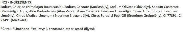 Sisältää Himalajan ruususuolaa, oliiviöljyä ja kookosöljyä sekä risiiniöljyä. Lisäsimme tähän suolasaippuaan aitoa Aloe Veraa, jota on perinteisesti käytetty erilaisten iho-ongelmien hoitoon. Aloe Veraa käytetään ihoa pehmentävänä, kosteuttavana ja rauhoittavana ainesosana, joka lievittää erilaisia ihon oireita. Tuoksuna virvoittavan raikas sitruksinen yhdistelmä aidoista eteerisistä öljyistä: Litsea, lime ja sitruuna sekä greippi.
