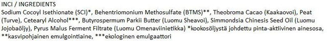 Sisältää laadukkaita hiuksia ja hiuspohjaa hoitavia kookosöljypohjaisia ainesosia, jojobaöljyä, sheavoita ja kaakaovoita sekä omenaviinietikkaa. Nämä ainesosat hoitavat ja suojaavat hiuksia parantaen niiden taipuisuutta samalla tehden hiuksista helposti kammattavat. Kasteen sisältämä jojobaöljy ja sheavoi sekä kaakaovoi ravitsevat, kosteuttavat ja suojaavat hiuksia sekä hiuspohjaa. Sisältää lisäksi LehtoPeat® hiushoitoturvetta.