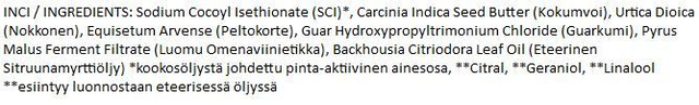Sisältää laadukkaita hiuksia ja hiuspohjaa hoitavia kookosöljypohjaisia ainesosia, kokumvoita ja guarkumia sekä omenaviinietikkaa. Nämä ainesosat hoitavat ja suojaavat hiuksia parantaen niiden taipuisuutta samalla vähentäen hiusten sähköisyyttä. Sisältää nokkosta, joka ravitsee hiuksia ja ehkäisee hilseen muodostumista. Sisältää peltokortetta, joka vahvistaa hiuksia ja tukee niiden kasvua. Tuoksuna eteerinen ja antiseptinen sitruunamyrttiöljy.