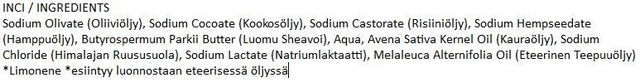 Sisältää oliiviöljyä, kookosöljyä, risiiniöljyä, hamppuöljyä, luomusheavoita ja kauraöljyä. Sisältää myös Himalajan ruususuolaa, joka on liuenneessa muodossa tässä saippuassa, joten tässä saippuapalassa on suolan ihoa hoitavat hyödyt ilman suolakiteitä. Teepuu saippuan herkullinen tuoksu tulee eteerisestä teepuuöljystä, joka on antiseptinen öljy.