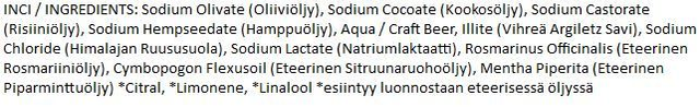 Sisältää laadukkaita hiuksia ja hiuspohjaa hoitavia öljyjä: Oliiviöljyä, kookosöljyä, risiiniöljyä ja hamppuöljyä sekä vihreää Argiletz savea. Shampoopala sisältää olutta, jolla on hiuksiin tuuheuttava ja taipuisuutta lisäävä vaikutus. Eteeriset öljyt (sitruunaruoho-rosmariini-minttu) vahvistavat hiuksia ja tukevat niiden luonnollista kiiltoa. Vihreä Savi on valikoimamme pesevin shampoopala. Kun alat käyttää shampoopalaa niin anna hiuksillesi aikaa tottua luonnolliseen, kasviöljyjä sisältävään shampoopalaan. Tämä saattaa kestää useita pesukertoja.