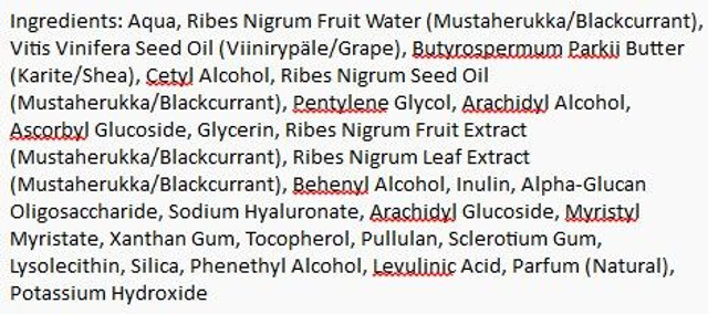 Ravitseva hoitovoide kasvoille sisältää ihoa suojaavaa antioksidanttista mustaherukkauutetta ja C-vitamiinia, joka auttaa kirkastamaan ihoa.