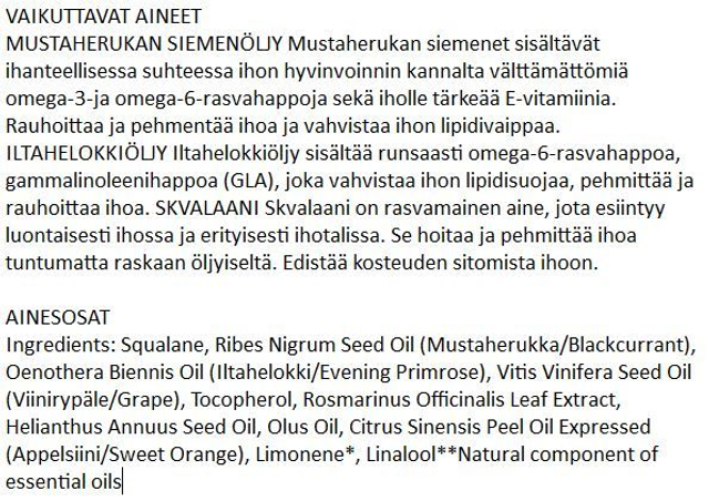 Ravitseva ja antioksidanttinen EKOPHARMA Herukka Omega-3 Kasvoöljy suojaa herkkää ja reaktiivista ihoa, ja sopii erittäin kuivalle iholle ja atooppiselle iholle. Herukka Kasvoöljy pehmittää ja rauhoittaa kuivaa, ärtynyttä ja hilseilevää ihoa. Runsaasti omega-rasvahappoja sisältävät mustaherukan siemenöljy ja iltahelokkiöljy vahvistavat herkän ihon lipidisuojaa ja hoitavat ihoa. E-vitamiini pehmittää ja suojaa oksidatiiviselta stressiltä.