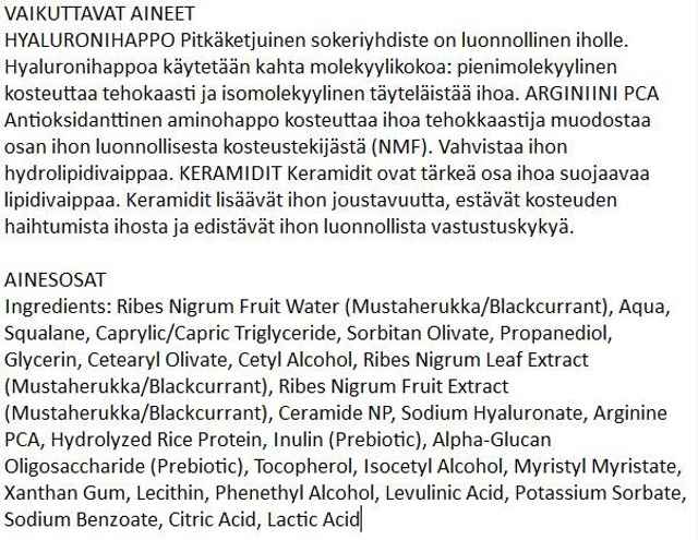 Mustaherukkapohjainen, rauhoittava ja napakoittava EKOPHARMA Herukka SOS Silmänympärysvoide sopii herkälle silmänympärysiholle. Antioksidanttista ja vitamiinirikasta mustaherukkauutetta sisältävä silmänympärysvoide kosteuttaa ja heleyttää ihoa. Mustaherukan siemenöljy ja helokkiöljy ravitsevat ihoa, keramidit vahvistavat ihon lipidisuojaa. Hyaluronihappo ja peptidit täyteläistävät ihoa ja lisäävät ihon kimmoisuutta, minkä lisäksi arginiini PCA kiinteyttää ohutta ihoa. Hajusteeton tuote.