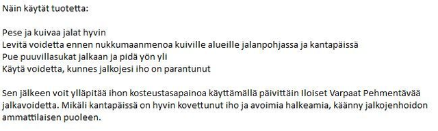 Iloiset Varpaat Super-kantapäävoide on karheille, kuiville ja halkeileville kantapäille tarkoitettu erikoisvoide, joka kerran päivässä käytettynä tuottaa tulosta jo muutamassa päivässä. Sopii myös diabeetikoille, mutta päivittäisessä käytössä max. viikon ajan. Ei suositella käyttöä raskaana oleville.