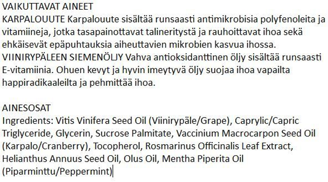 Geelimäinen Ekopharma Karpalo CLEAR Puhdistusöljy muuntuu iholla maitomaiseksi emulsioksi, mikä puhdistaa ihoa tehokkaasti vieden mukanaan myös meikin. Antioksidanttinen viinirypäleen siemenöljy tuntuu kevyen ohuelta iholla. Karpalouute sisältää antimikrobisia yhdisteitä, jotka tasapainottavat ihoa. Puhdistava, vesiliukoinen öljypuhdistus jättää ihon raikkaan ja pehmeän tuntuiseksi.