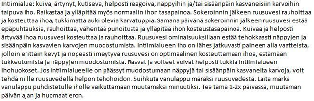 Intiimialue: kuiva, ärtynyt, kutiseva, helposti reagoiva, näppyihin ja/tai sisäänpäin kasvaneisiin karvoihin taipuva iho.