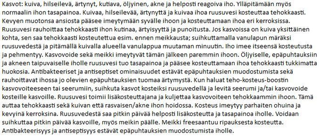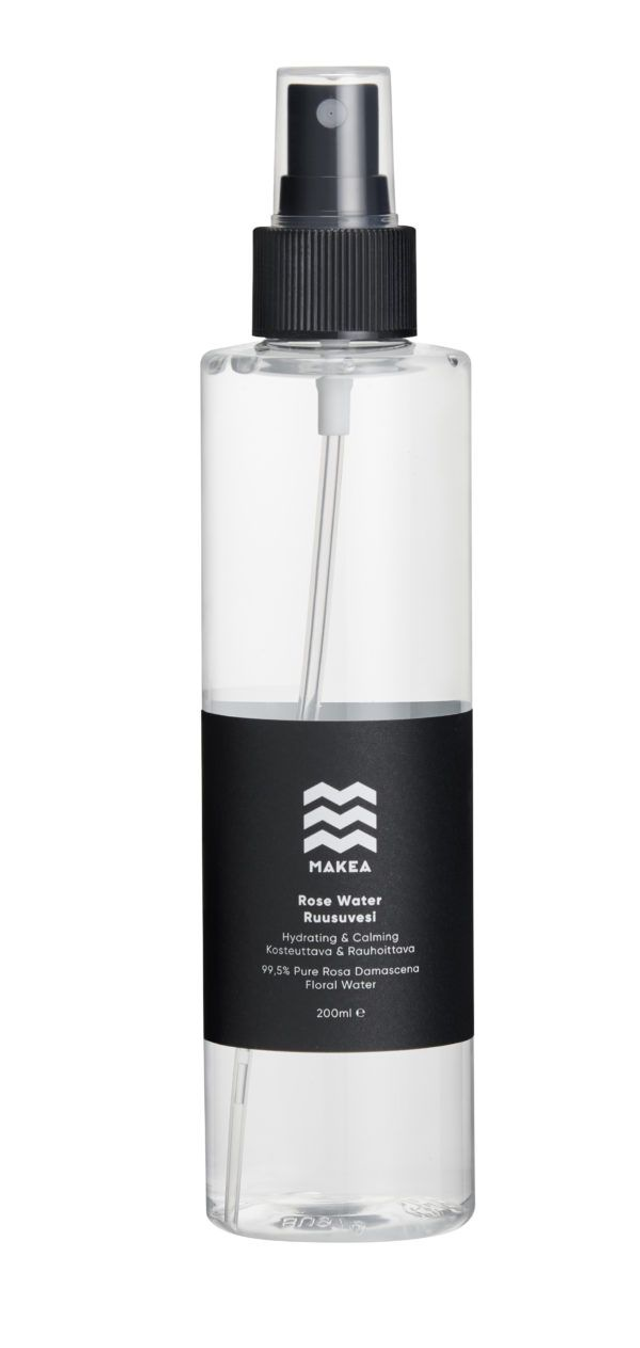 Ruusuvesi: kosteuttaa, rauhoittaa, vähentää punoitusta, tasapainottaa ihoa.