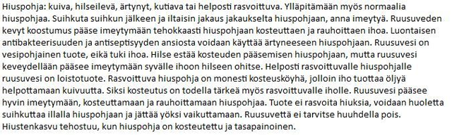 Hiuspohja: kuiva, hilseilevä, ärtynyt, kutiava tai helposti rasvoittuva. Ylläpitämään myös normaalia hiuspohjaa.