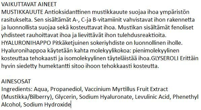 Hellävarainen ja hajusteeton Ekopharma Mustikka Sensitive Kasvovesi herkälle iholle sisältää antioksidanttista mustikkauutetta, joka suojaa ihoa ympäristön rasitukselta. Hyvin siedetyt ihon kosteuttajat, kuten hyaluronihappo, sitovat ihoon kosteutta ja lisäävät ihon kimmoisuutta.