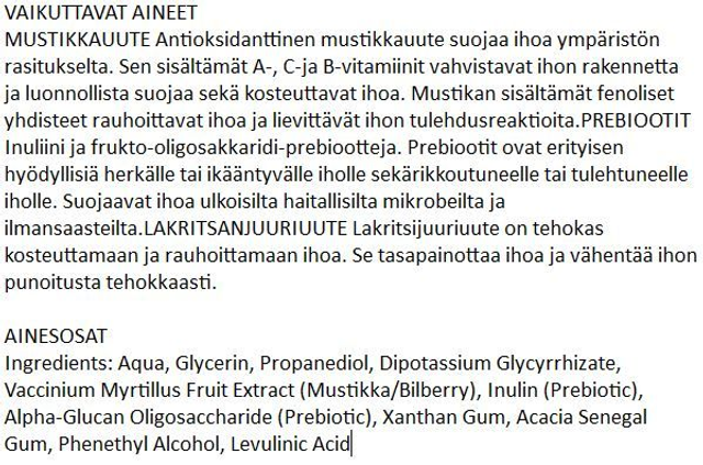 Kosteuttava ja rauhoittava EKOPHARMA Mustikka Sensitive Seerumi herkälle iholle. Antioksidanttinen ja vitamiinirikas mustikkauute rauhoittaa ihoa ja lakritsijuuriuute vähentää ihon punoitusta. Prebiootit vahvistavat ihon luonnollista suojaa. Hajusteeton koostumus.