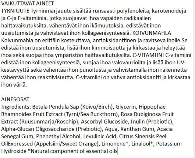 Täyteläinen koivunmahlapohjainen Ekopharma Tyrni VITAL Kasvovesi sopii erityisesti kuivan ja aikuisen ihon hoitoon. Tyrni- ja ruusunmarjauute sisältävät runsaasti antioksidantteja ja vitamiineja, jotka lisäävät ihon elinvoimaa. C-vitamiini kirkastaa ja heleyttää ihoa. Kosteuttava hoitovesi sisältää ihon luonnollista suojaa lisääviä prebiootteja, mitkä suojaavat ihoa ympäristön haittavaikutuksilta. Tuote sopii kosteuttamaan aikuista ja kuivaa ihoa, hoitamaan ihon UV-valovaurioita sekä kirkastamaan elotonta ja sameaa ihoa.