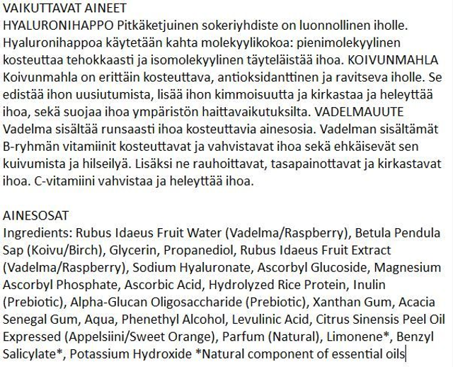 Vadelma-ja koivunmahlapohjainen syvävaikutteinen EKOPHARMA Vadelma Hyaluron Booster seerumi sisältää ihoa suojaavia antioksidantteja sekä kosteuttavia ja heleyttäviä B-vitamiineja. Seerumissa on kahdenlaista hyaluronihappoa, mitkä täyteläistävät ihoa ja kosteuttavat sitä tehokkaasti. C-vitamiini edistää ihon kimmoisaa rakennetta ja kirkastaa ihon väriä sekä suojaa ympäristön haittavaikutuksilta. Sopii erityisesti kuivan ja samean ihon hoitoon.